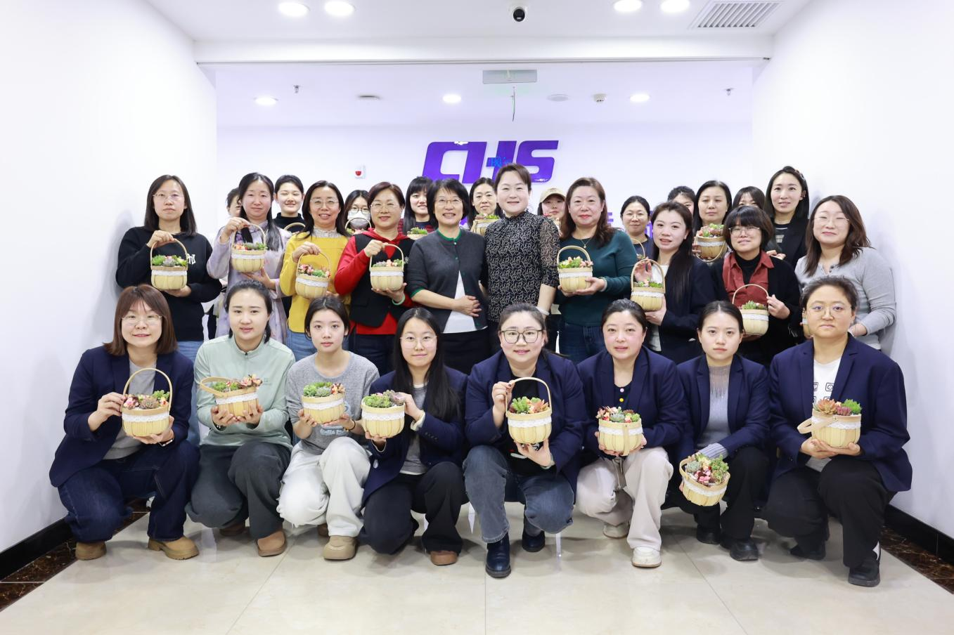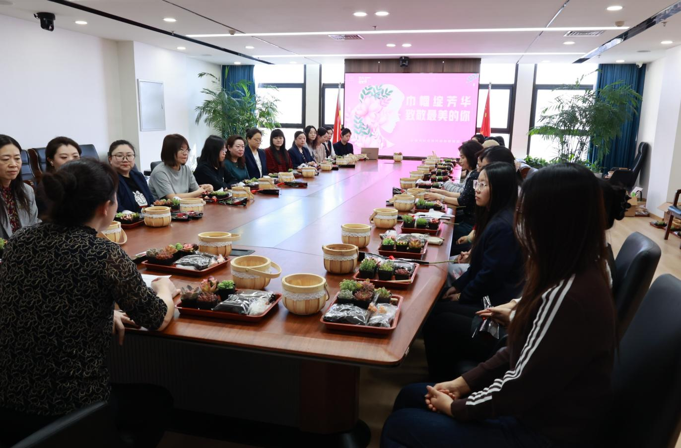 活动从专业花艺老师受邀现场授课开始,从多肉植物的品种习性、日常养护要点到盆景造型技巧,进行了生动细致的讲解。在专业老师的指导下,女职工们兴致勃勃地动手制作:填土、栽种、铺石、装饰,大家充分发挥创意,将形态各异的多肉搭配组合,打造出一个个错落有致、生机勃勃的微景观盆景。制作过程中,大家互相交流技巧,彼此分享心得,现场欢声笑语不断,洋溢着轻松愉悦的节日氛围。